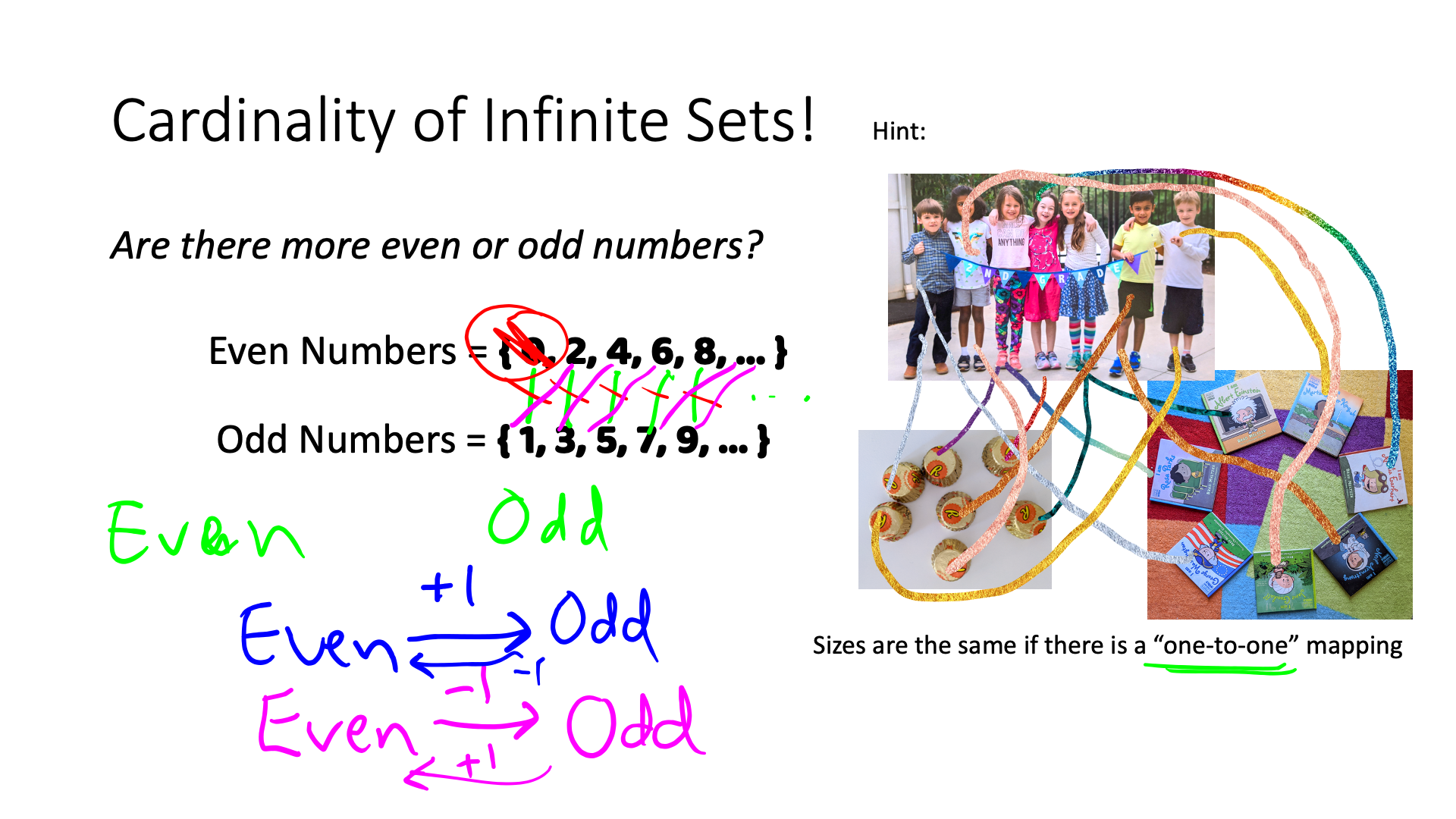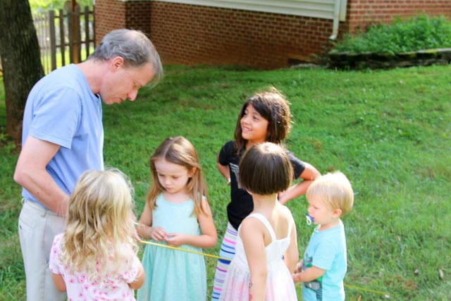 Five apples are in a basket. How do you divide them among five girls so that each girl gets and apple, but one apple remains in the basket. (From The Moscow Puzzles, by Boris A Kordemsky) This was quite confusing, until David brought a prop. Then it seemed silly.